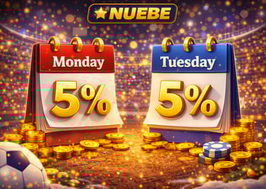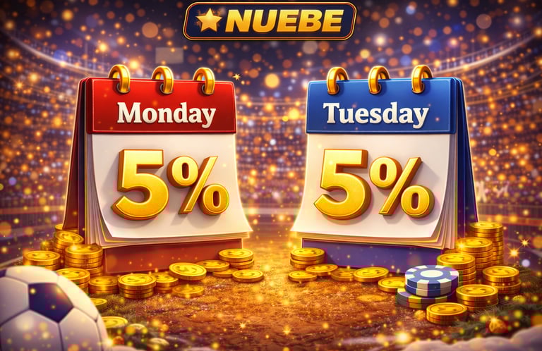 The 5% Monday Free Bet + 5% Tuesday Free Bet reflects how NUEBE continues to design promotions that emphasize balance and predictability. By highlighting two consecutive days, the feature encourages steady participation while maintaining a straightforward and easy-to-follow structure that feels accessible and well-paced.